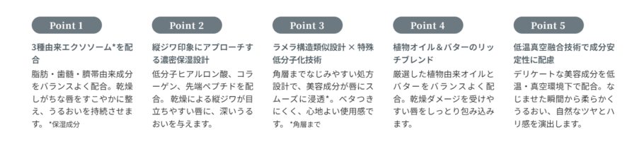3種由来エクソソーム*1 を配合し、うるおいを与えながらふっくらとした唇印象へ導きます。